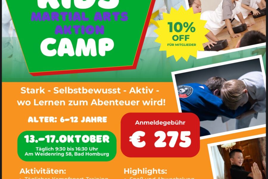 WTPlus Bad Homburg Martial Arts Gym Kids Martial Arts Camp – 13-17 Oktober 2025 Liebe Schüler und Eltern,Anbei finden Sie den Flyer und Informationen zu unserem Kinder-Kampfsportcamp im Oktober.…adminSeptember 5, 2025
